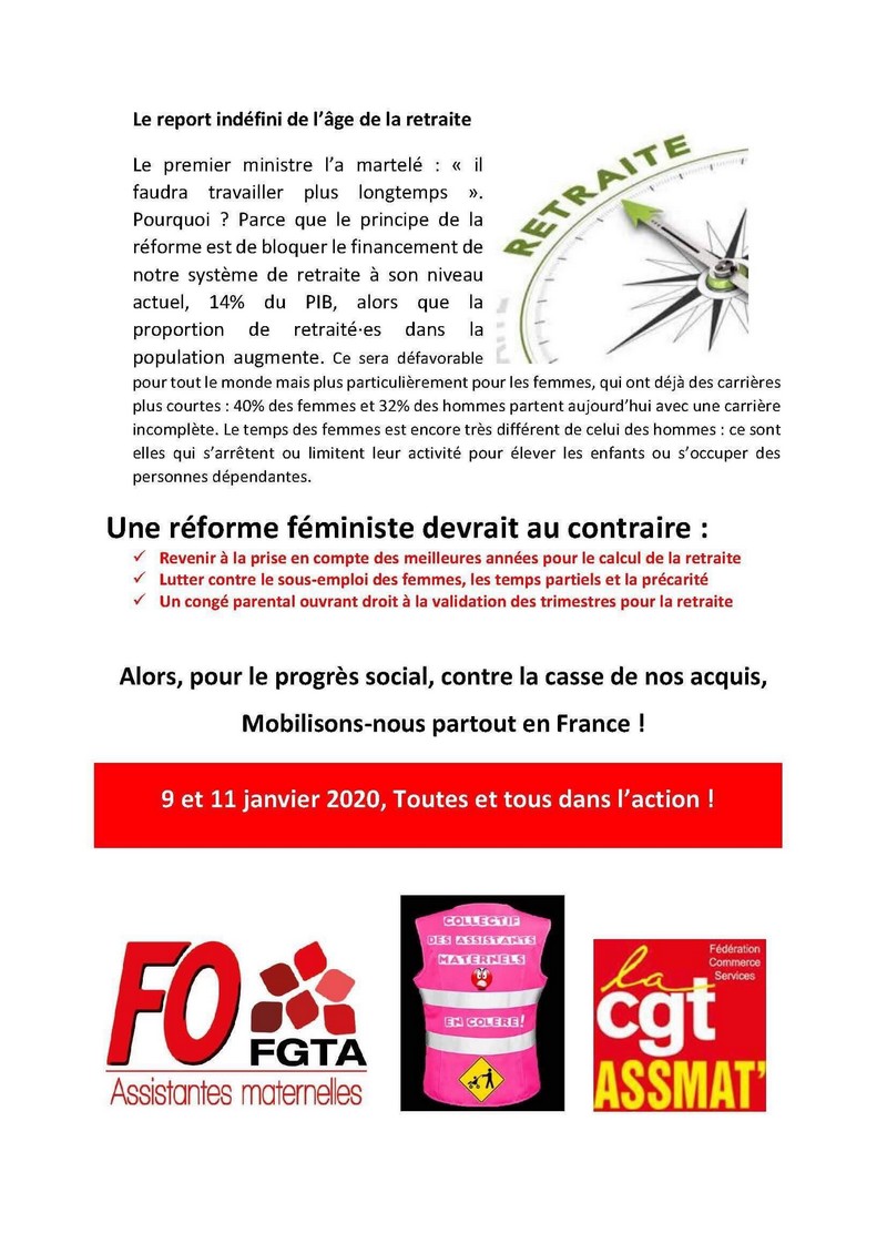 le collectif national des assistants maternels en colère gilets roses et ses référents appellent les assistant(e)s maternel(le)s à la grève le jeudi 9 janvier et samedi 11 janvier et à rejoindre les manifestations contre la réforme des retraites. Pour Laval j’appelle à la mobilisation jeudi et samedi pour celles et ceux qui le peuvent. En effet au vu des spécificités de notre métier il est difficile de faire grève, pas facile pour nos parents employeurs et difficultés pour nous de perdre financièrement une journée de travail. Mais il reste le samedi où nous pouvons nous déplacer, nous retrouver,pour ma part je serais présent à Laval samedi 11 janvier.