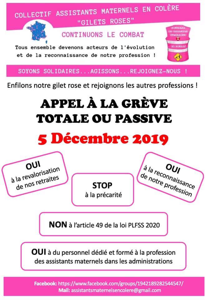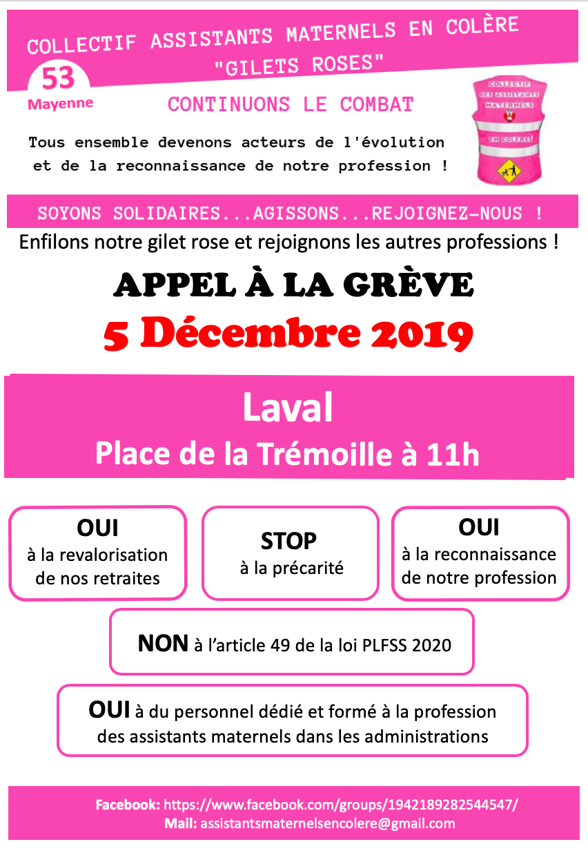 Le collectif national des assistants maternels en colère gilets roses appelle à la mobilisation du 5 décembre 2019 et à rejoindre les autres professions lors des manifestations organisées ce jour là. Pour Laval le rendez vous est fixé Place de la Trémoille à 11h00.