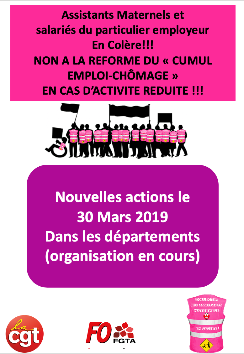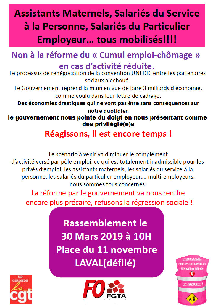 rassemblons nous samedi 30 mars à 10h place du 11 novembre à Laval,parce que nous refusons la réforme cumul emploi-chômage,nous allons l'arrêter,nous refusons la diminution de l'ARE,nous ne sommes pas des privilégié(e)s,nous sommes fiers de notre métier,nous sommes fiers de nous!