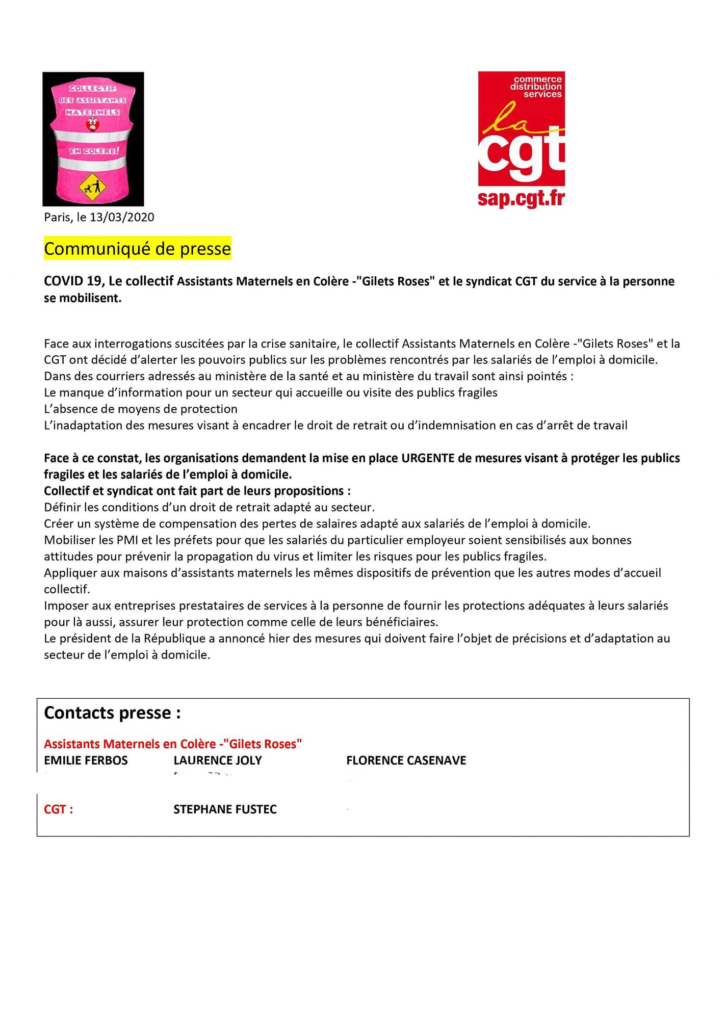 Covid 19 communiqué de presse des gilets roses et de la CGT service à la personne