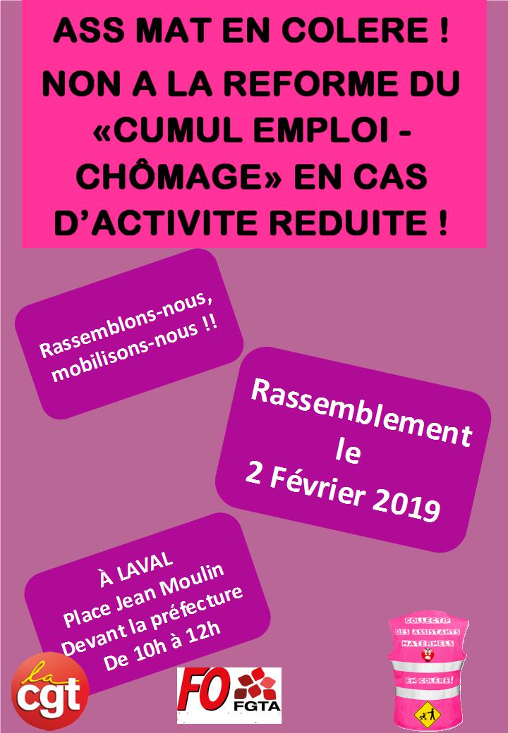 NON à la réforme cumul emploi-chômage,parce que nous sommes fiers de notre profession et que nous l'adorons retrouvons nous samedi 2 février à Laval devant la préfecture de 10h à 12h pour montrer que nous existons.En délégation je serais reçu par le directeur de cabinet de monsieur le préfet.